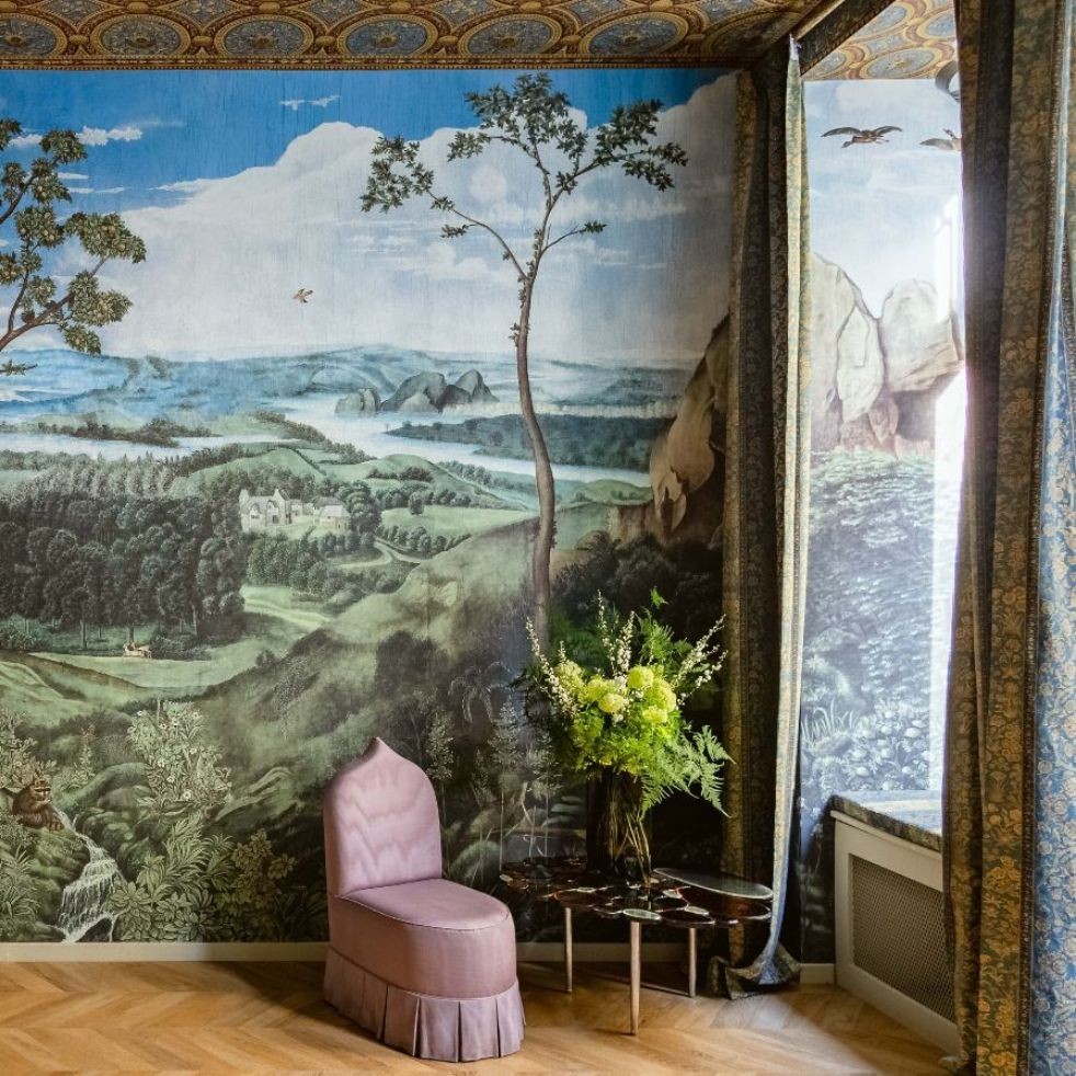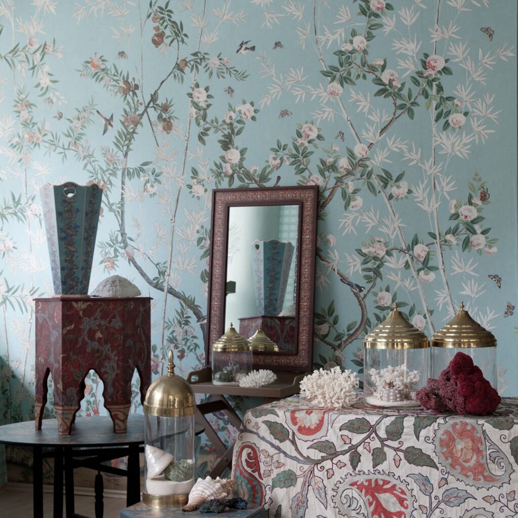 The link between the new Chinoiserie and the deep blue of Patinir Landscape can be found in the showroom of Roberto Molteni (Via Durini 3). Here, the interior designer selected the Chinoiserie Eastern Eden in the Turquoise colorway to decorate the ground floor of this impressive six-story showroom, occupying 1,250 sqm of a Milanese palazzo dedicated to the finest contemporary design.