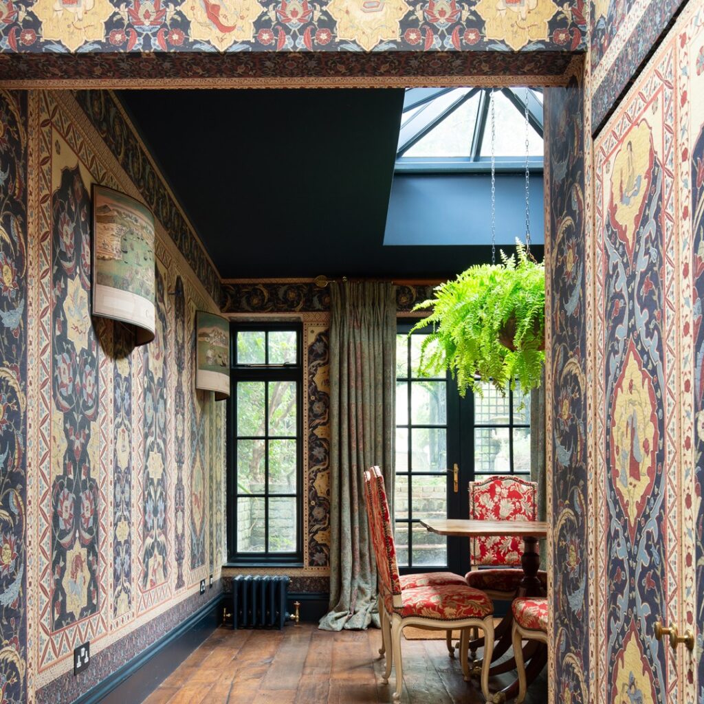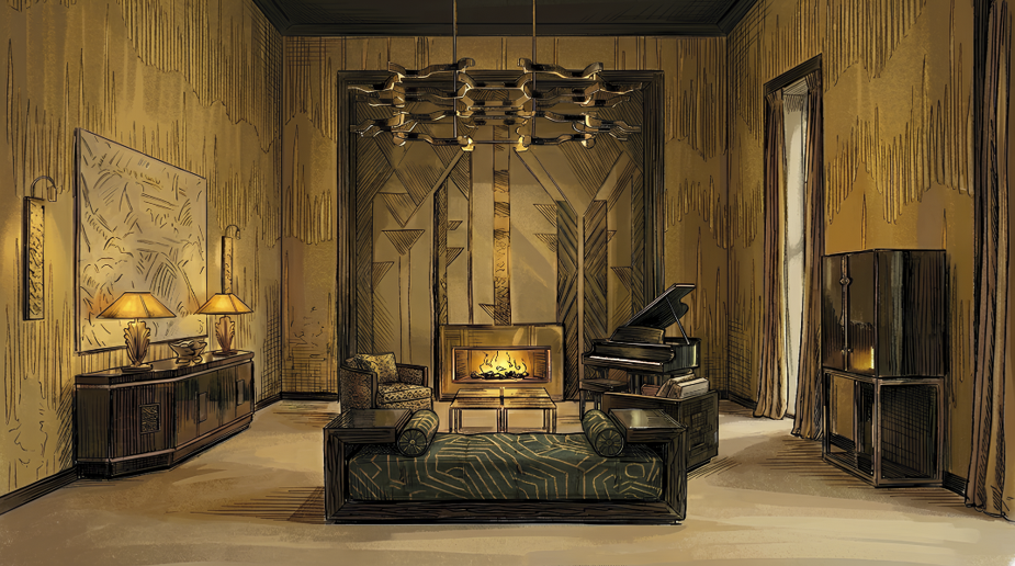 For the smoking parlour, the choice fell on two Decors launched at this year’s Paris Déco Off. On the walls: Deco Forest, originally designed for the smoking room of a Parisian apartment. This geometric Scenic Decor of palm trees captures the glamorous aura of the 1930s. On the ceiling, the assorted Celestial Orbs Ceiling, custom-made on fabric. In the Living Room, a variation of Celestial Orbs decorates the ceiling. The Bedroom Ceiling features Granada Circles, while the Dining Room showcases Moody Mountain Ceiling, custom-made on fabric. At the heart of the booth, the Winter Garden features a variation of Moody Mountains Ceiling, as appearing also in the Bathroom, assorted to Moody Mountain Scenic Decor on the walls.