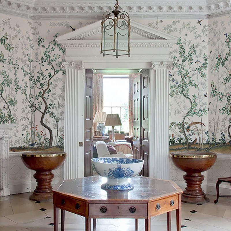 We present Pearl River, our latest Scenic Decor. This design, composed and painted in our studio, is inspired by a late‑18th‑Century view of Canton. The scene captures vivid details of daily life along the Pearl River delta, from bustling boat traffic to the iconic panorama of the foreign concessions. This Decor belongs to a genre of souvenir paintings that European merchants often brought home from their travels in the Far East. We completed it with assorted Architectural elements like borders and wainscotings, as well as two different ceiling designs.